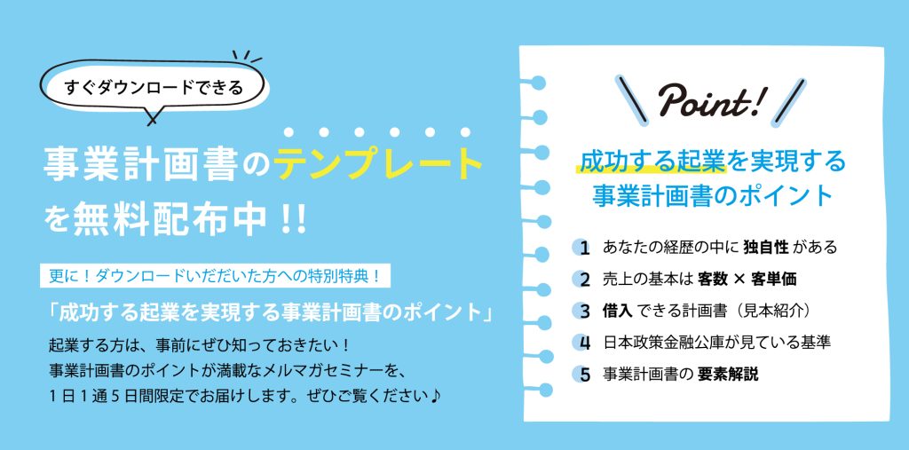 これから起業する方に向けた内容です。登録後、すぐにメールが届き、『事業計画書のテンプレート』がダウンロードできます。5日間連続で1日1通、メールが届くステップメールです。